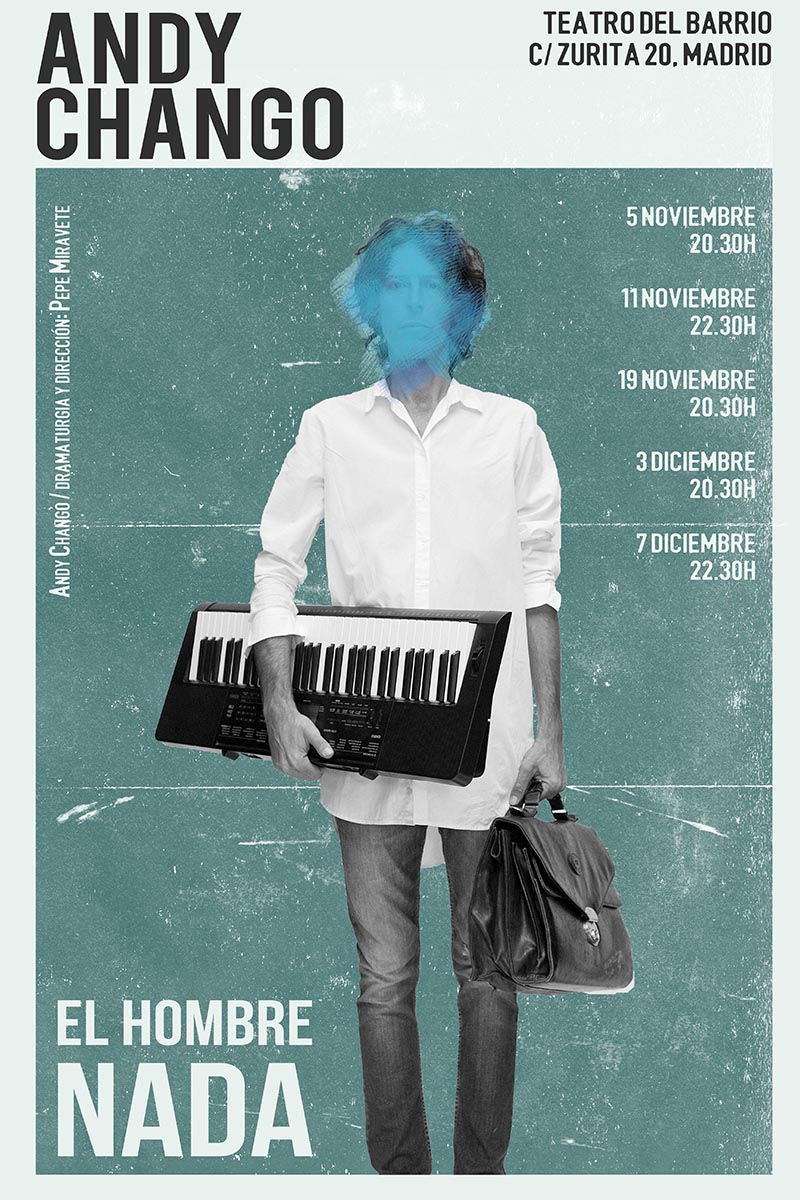 Andy Chango presenta en Madrid su nuevo espectáculo “El hombre nada”. Un espectáculo difícil de definir ya que combina diferentes facetas de un solo artista: los textos -quizás surgidos a raíz de la publicación de “Indianápolis”, su primera novela (Ed. Planeta/2016)-, el humor verbal, potenciado por su experiencia televisiva en los últimos años en argentina por la que fue nominado a los premios más importantes de dicha televisión (Martín Fierro) y su ya conocida trayectoria como cantante y compositor.